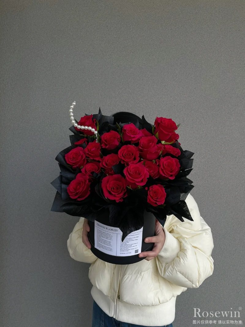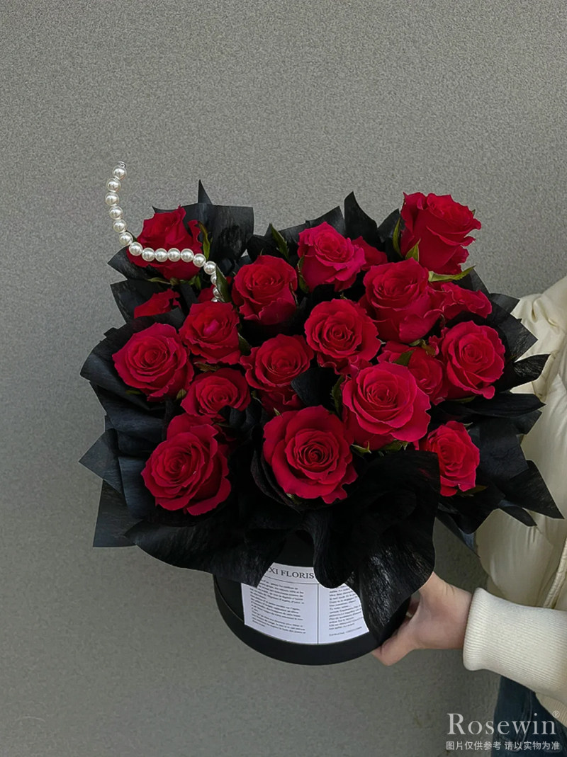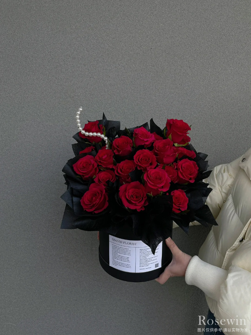 19朵紅玫瑰,黑色手揉紙,白色珍珠串裝飾