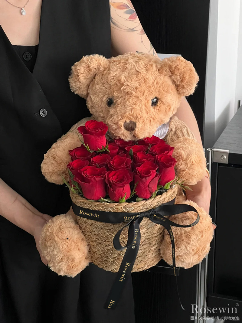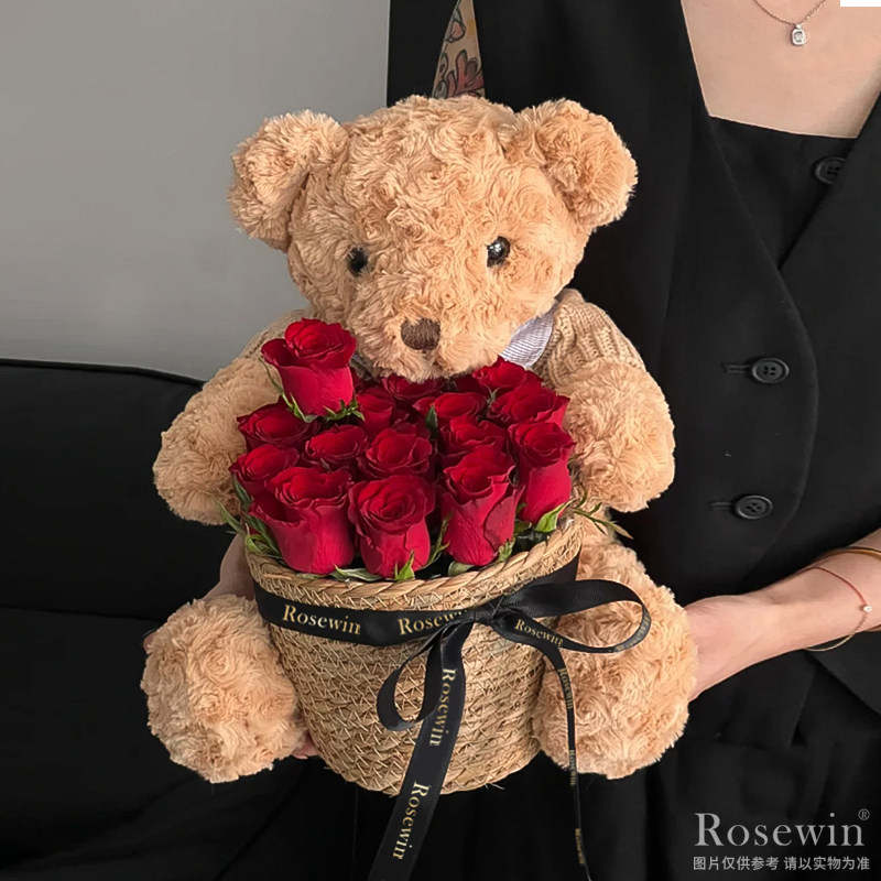 甜蜜小熊-19朵紅玫瑰甜蜜小熊抱抱桶