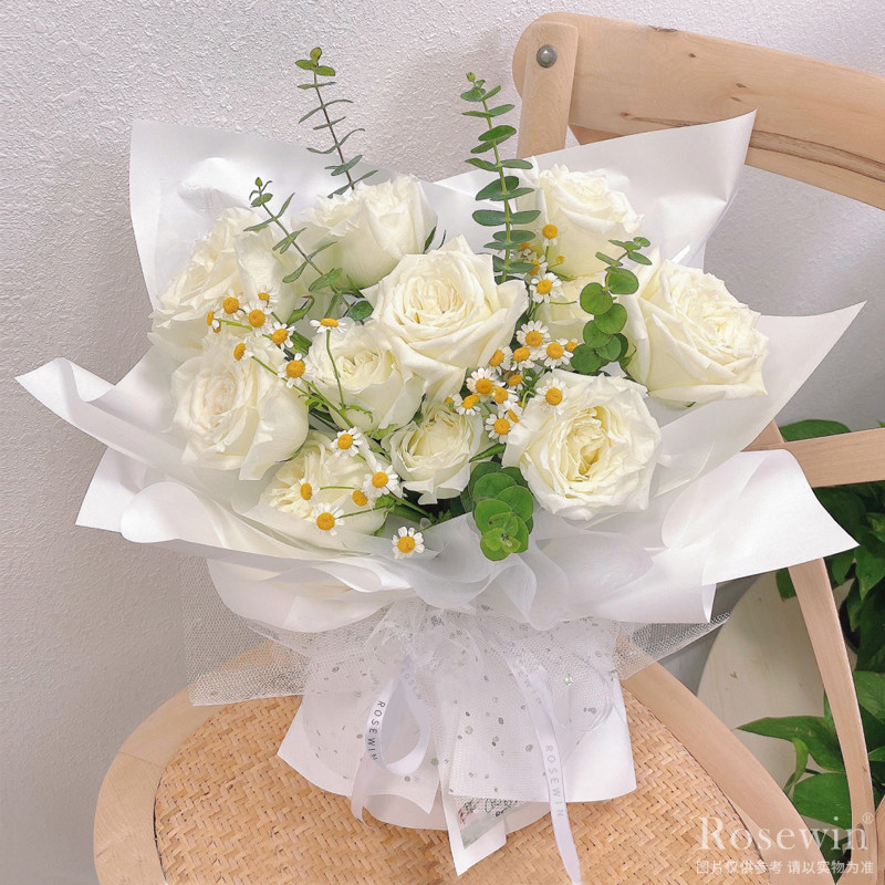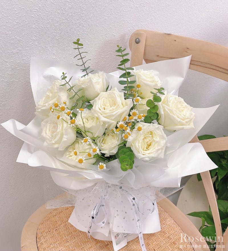 11朵白玫瑰,適量洋甘菊、尤加利葉裝飾