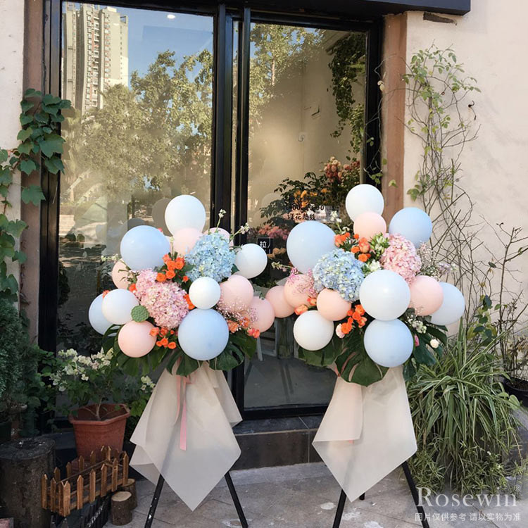 馬卡龍色氣球(白色、淺藍色、淺粉色)+粉繡球+藍繡球+橘色多頭小玫瑰,搭配適量粉色滿天星、白色相思梅、蓮蓬、龜背葉裝飾。