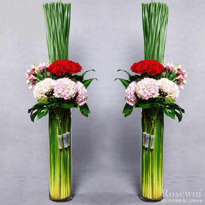 粉繡球+紅玫瑰+粉色洋桔梗,搭配適量龜背葉裝飾。