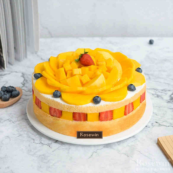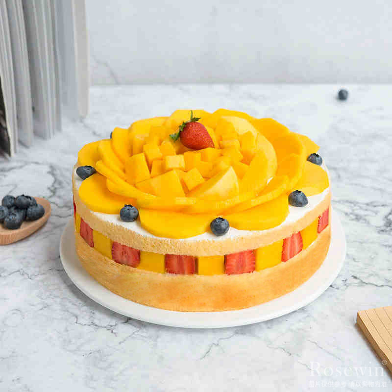 圓形水果蛋糕,表面豐滿水果平鋪,內(nèi)層水果填充。