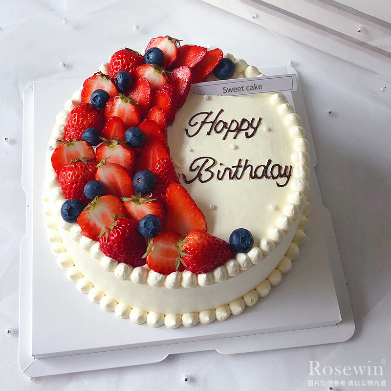 原味蛋糕胚+乳脂奶油(含水果果肉填充)疊層,表層草莓、藍莓、可食用糖珠裝飾。