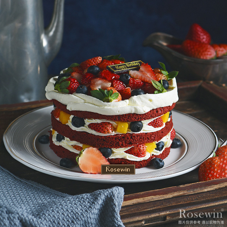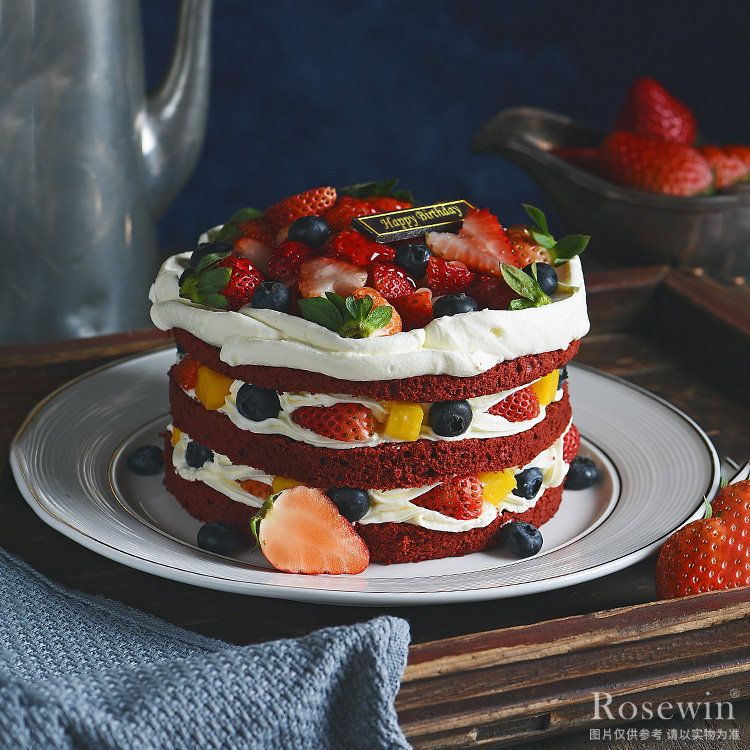 圓形水果紅絲絨蛋糕,表面豐滿水果平鋪、中間雙層水果+原味乳脂奶油填充。
