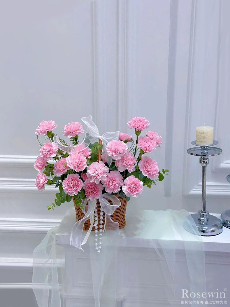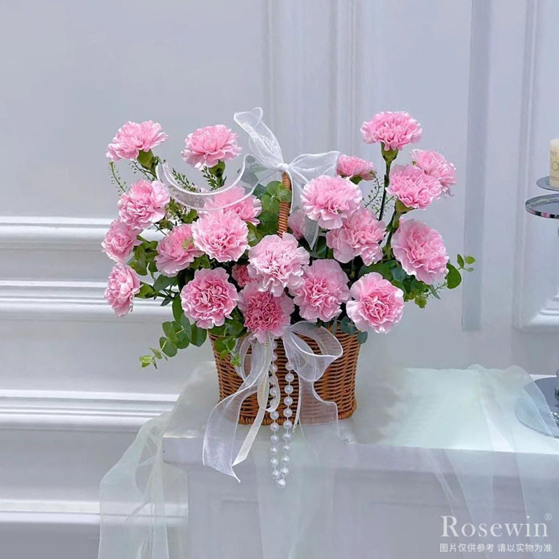 19朵粉色康乃馨,適量尤加利葉,白色蕾絲蝴蝶結(jié),白色珍珠裝飾