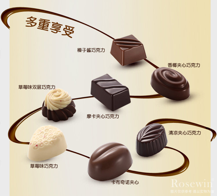 巧克力包裝顏色因每個地區(qū)差異難免會與圖片有些出入,但我們保證巧克力的主材品種、新鮮程度、數(shù)量、顏色與說明一致。