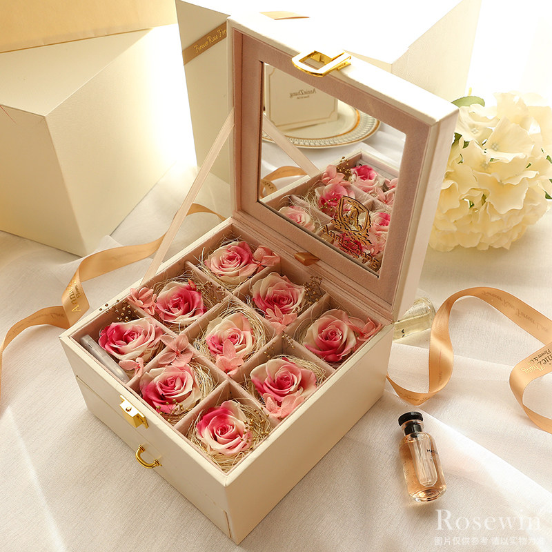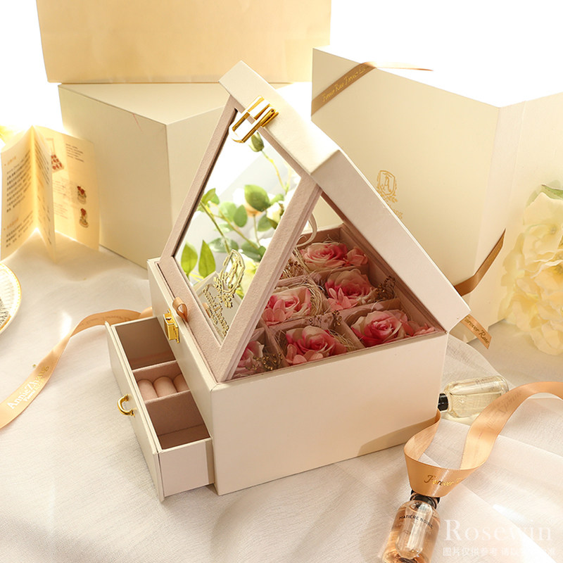單位重量0.71 kg 產(chǎn)品體積 19.0 cm * 19.0 cm * 14.0 cm甄選厄瓜多爾永生玫瑰花頭,36道工藝,手工制作,花材飽滿,色澤圓潤,內(nèi)設抽屜,存放首飾,翻蓋后設梳妝鏡,方便實用,永生花裝飾,可做家居擺件。