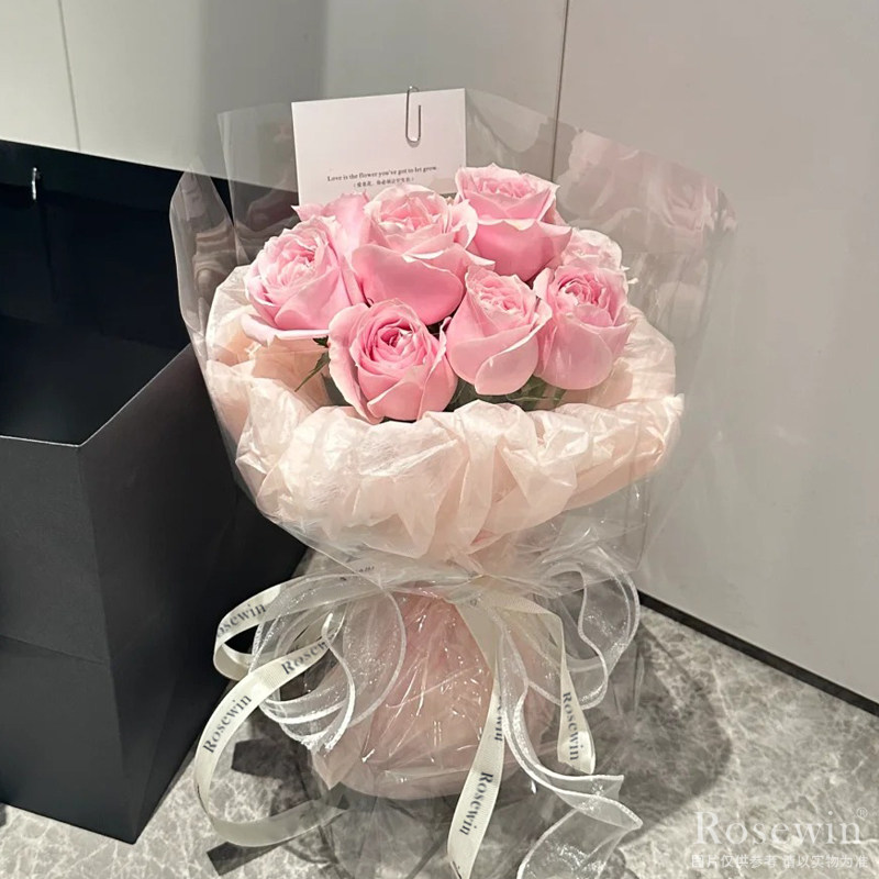 粉色手揉紙,白色透明玻璃紙,白色蕾絲帶,白色帶英文絲帶束扎