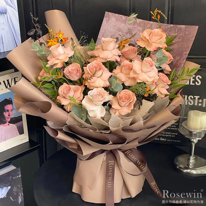 19朵卡布奇諾玫瑰,綠葉等裝飾
