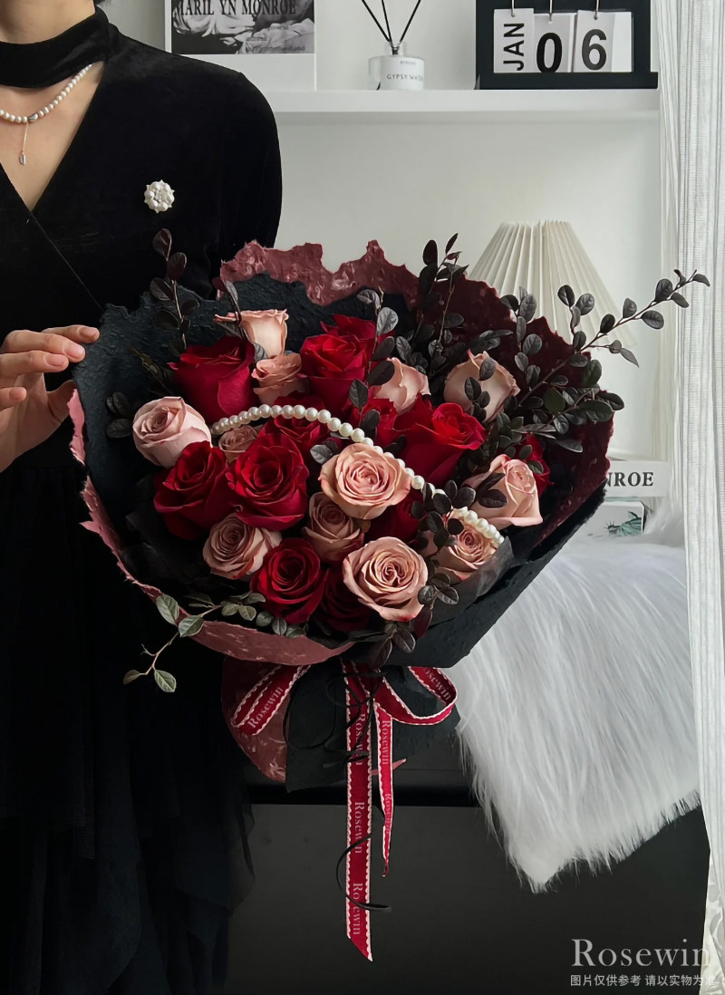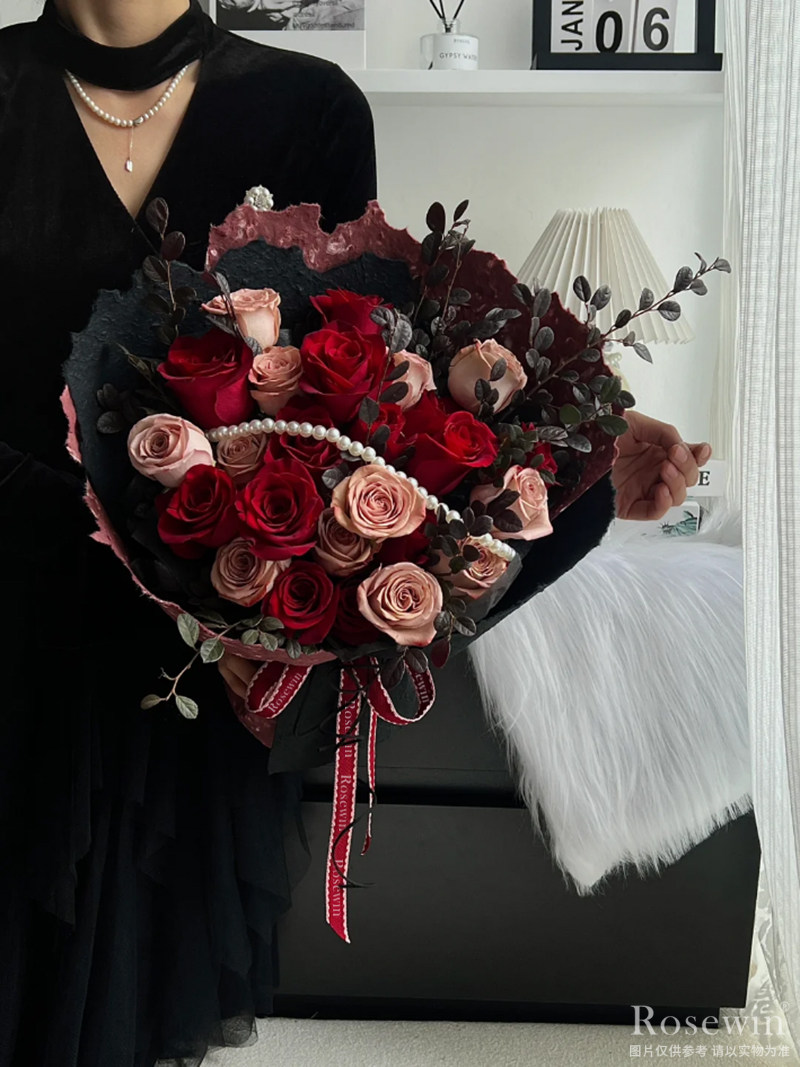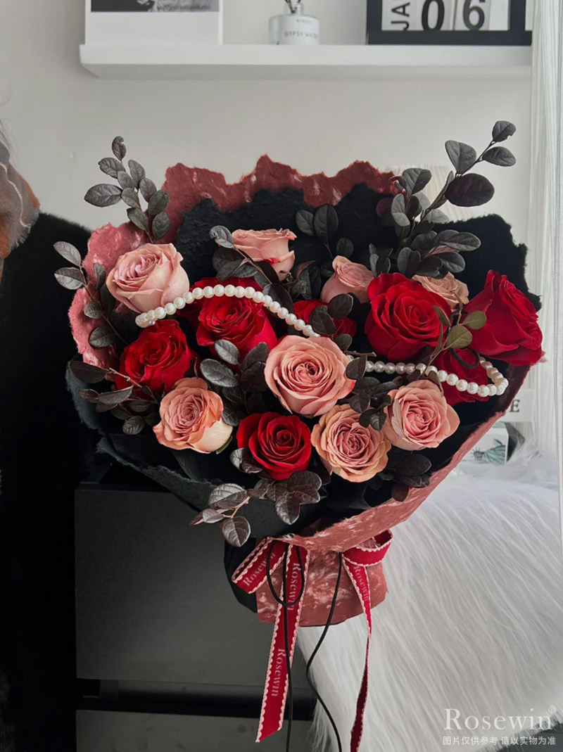 19朵混色玫瑰(10朵卡布奇諾玫瑰,9朵紅玫瑰),適量綠葉,白色珍珠串裝飾