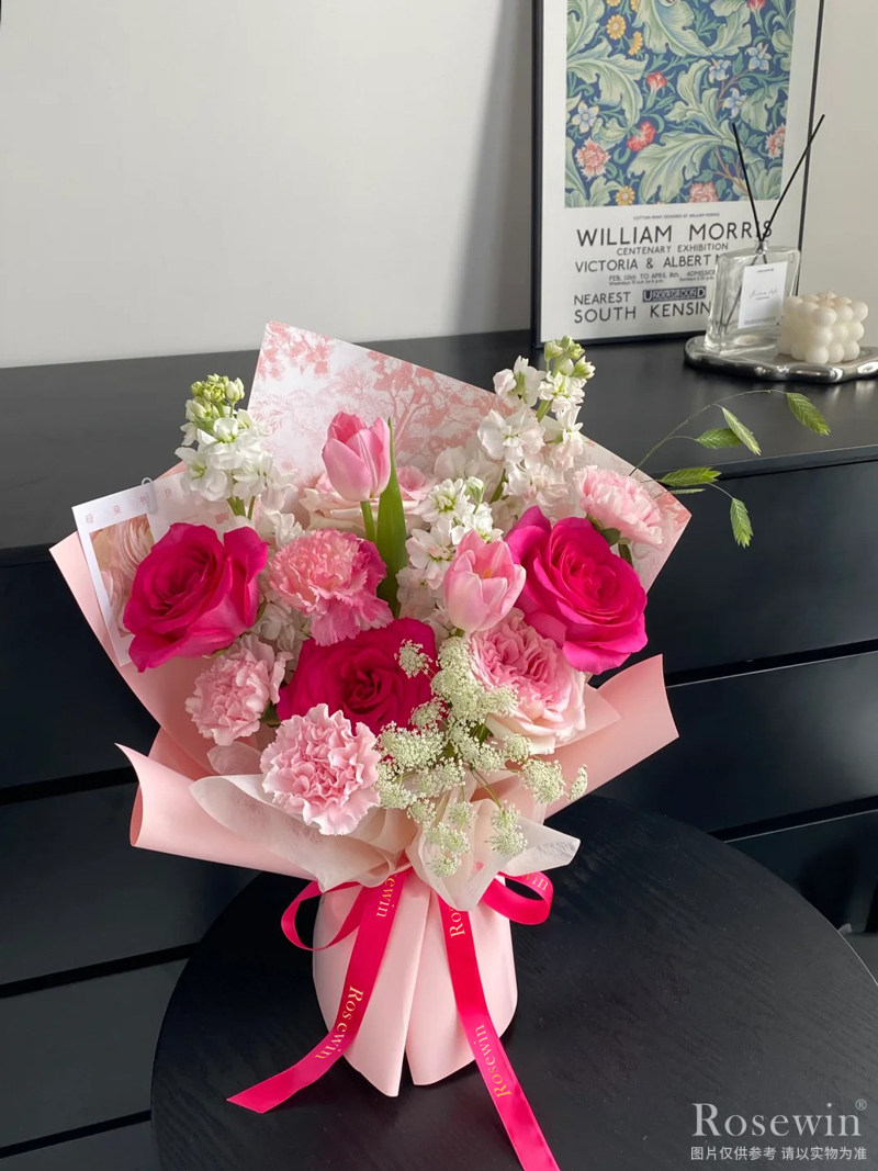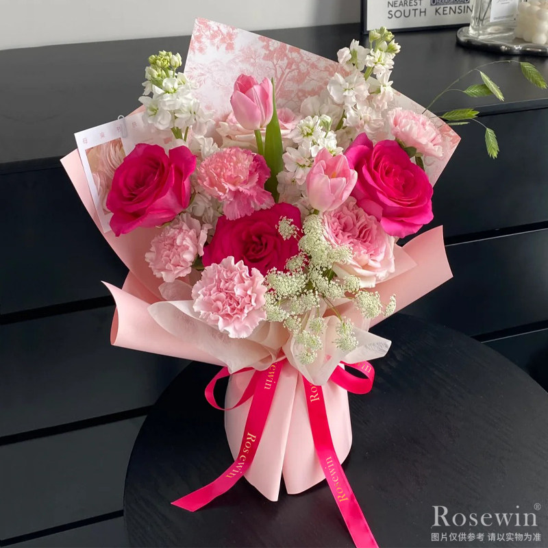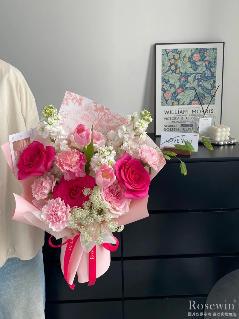 3朵弗洛伊德玫瑰,2朵粉色荔枝玫瑰,2朵粉色郁金香,4朵粉色康乃馨,適量白色紫羅蘭,蕾絲花裝飾