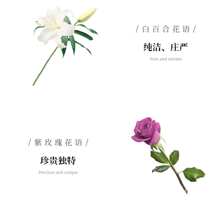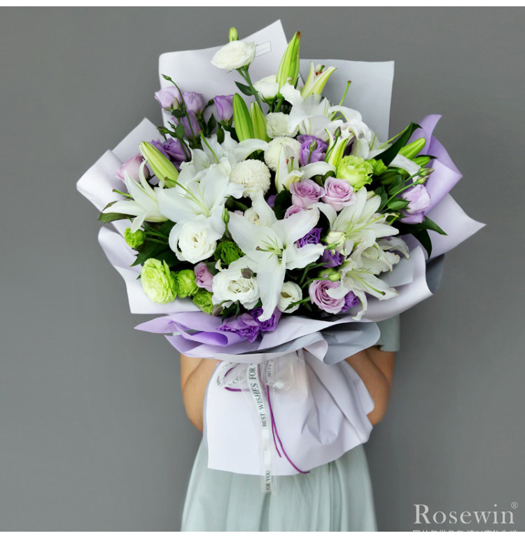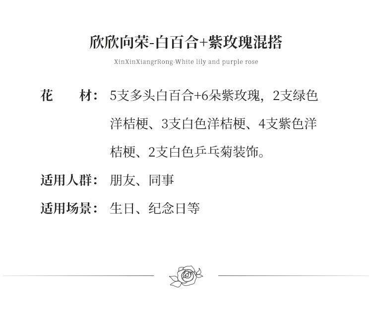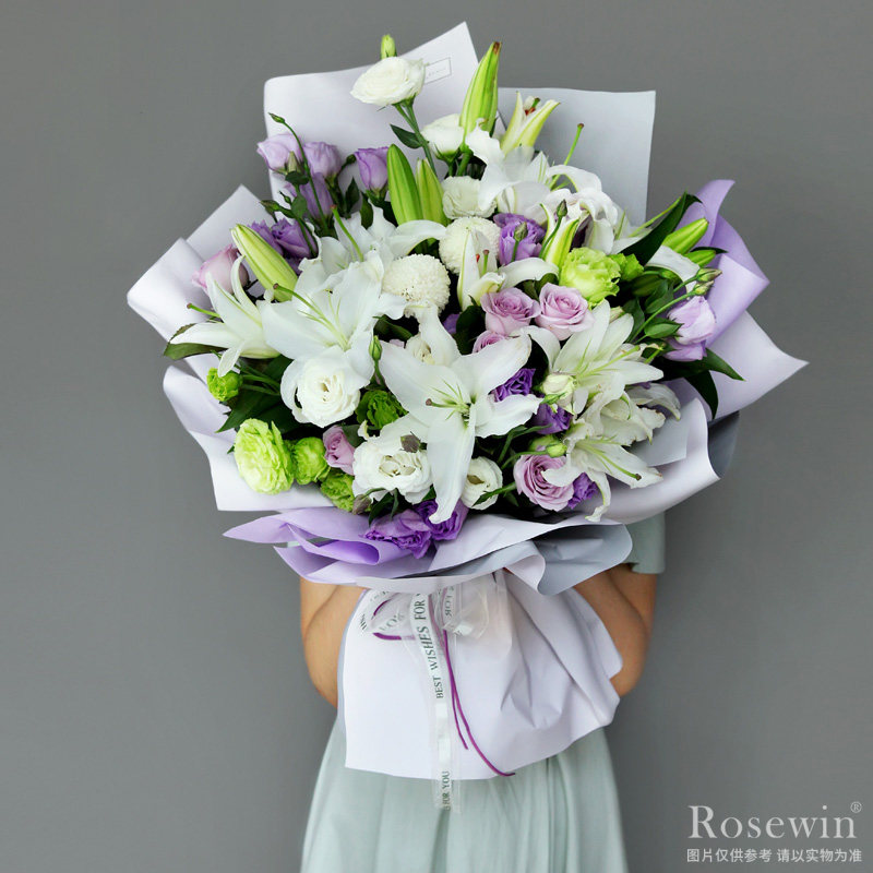 5支多頭白百合+6朵紫玫瑰,2支綠色洋桔梗、3支白色洋桔梗、4支紫色洋桔梗、2支白色乒乓菊裝飾。