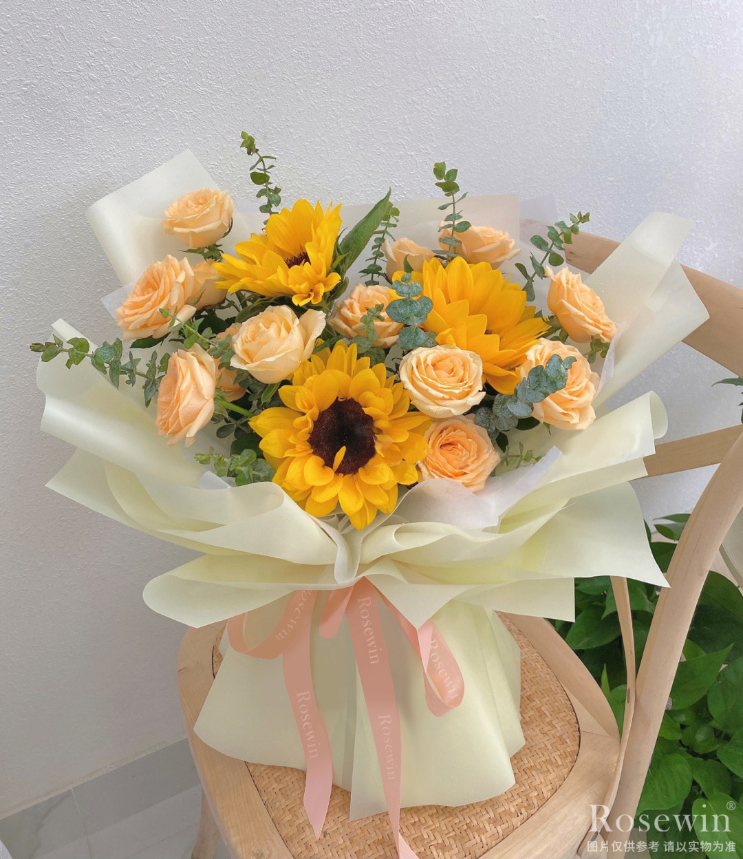 11朵香檳玫瑰,3朵向日葵,適量尤加利葉裝飾