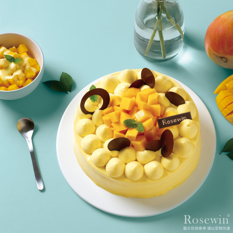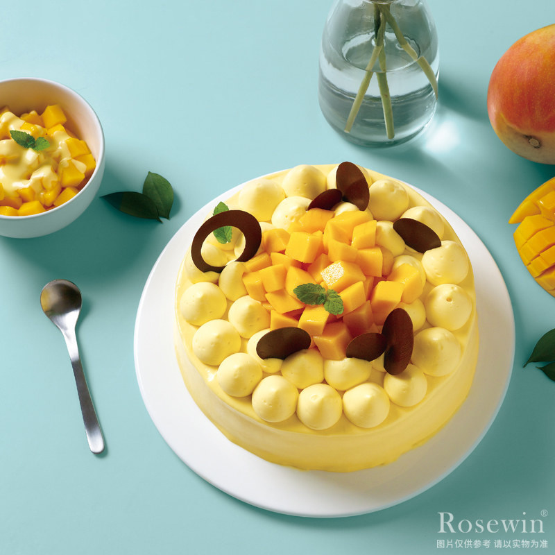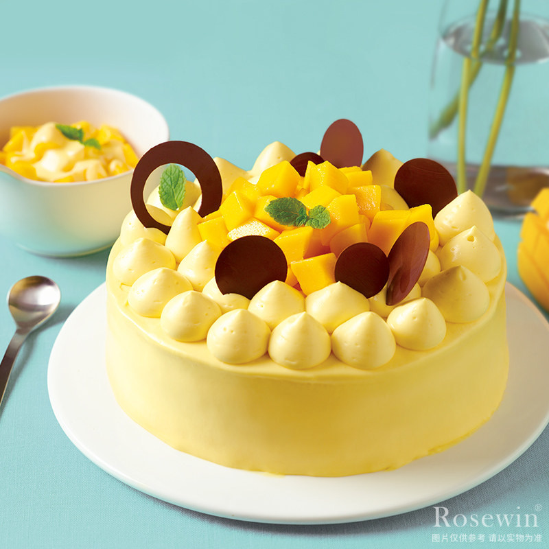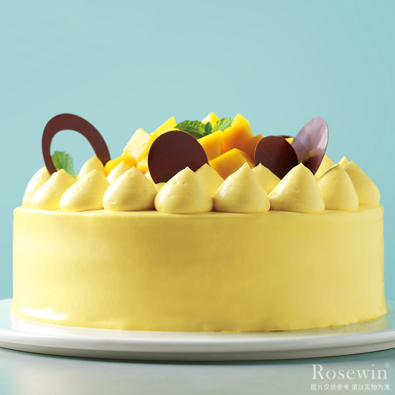 圓形芒果鮮奶蛋糕。戚風(fēng)蛋糕胚+芒果乳脂奶油(含新鮮芒果)疊層,表層芒果乳脂奶油+新鮮芒果+巧克力薄片裝飾。(本款產(chǎn)品適宜食用溫度為0-5攝氏度之間,請收到蛋糕后立即放入冰箱貯存)