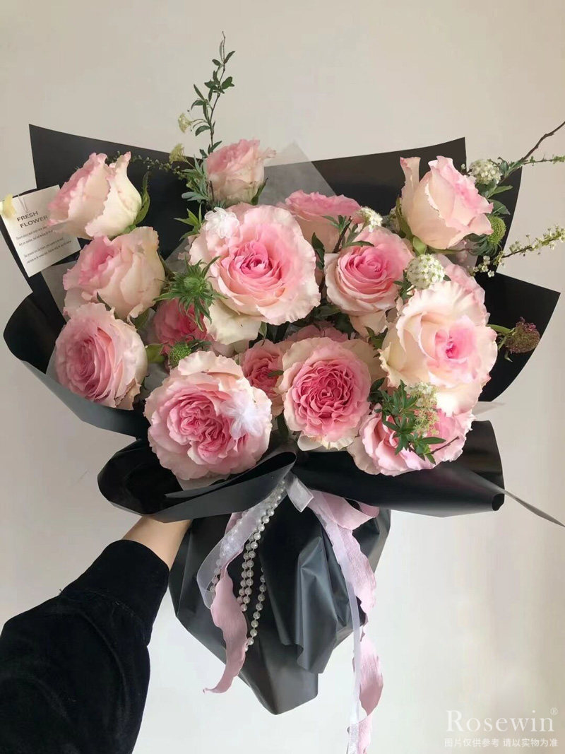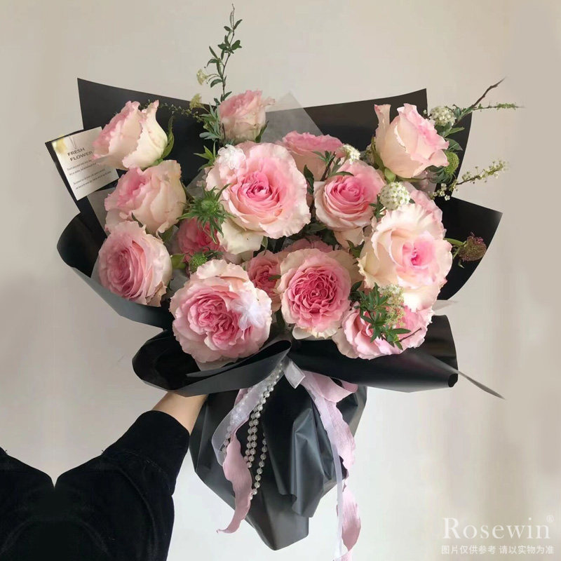 粉色霧面紙,黑色霧面紙包裝,白色絲帶,粉色絲帶,白色珍珠串束扎