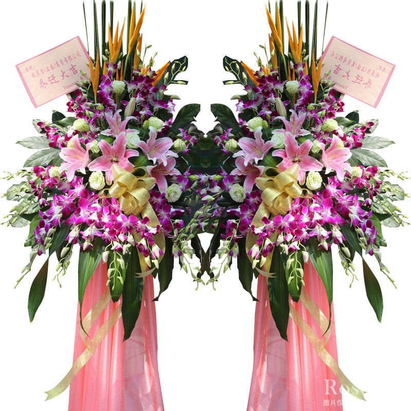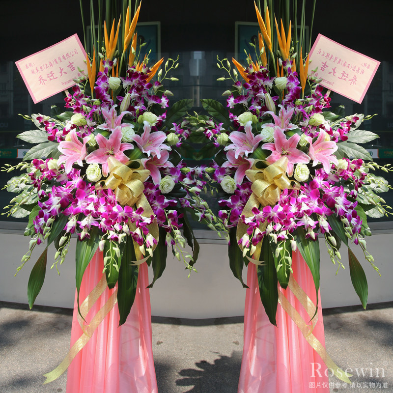 經(jīng)典開業(yè)花籃,粉色緞布包裹,香檳色緞帶蝴蝶結(jié)裝飾(單個)