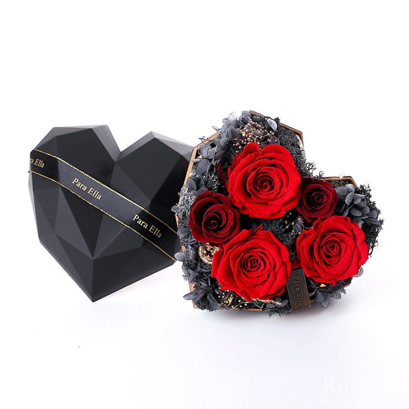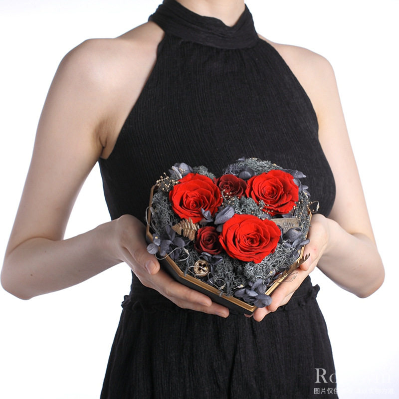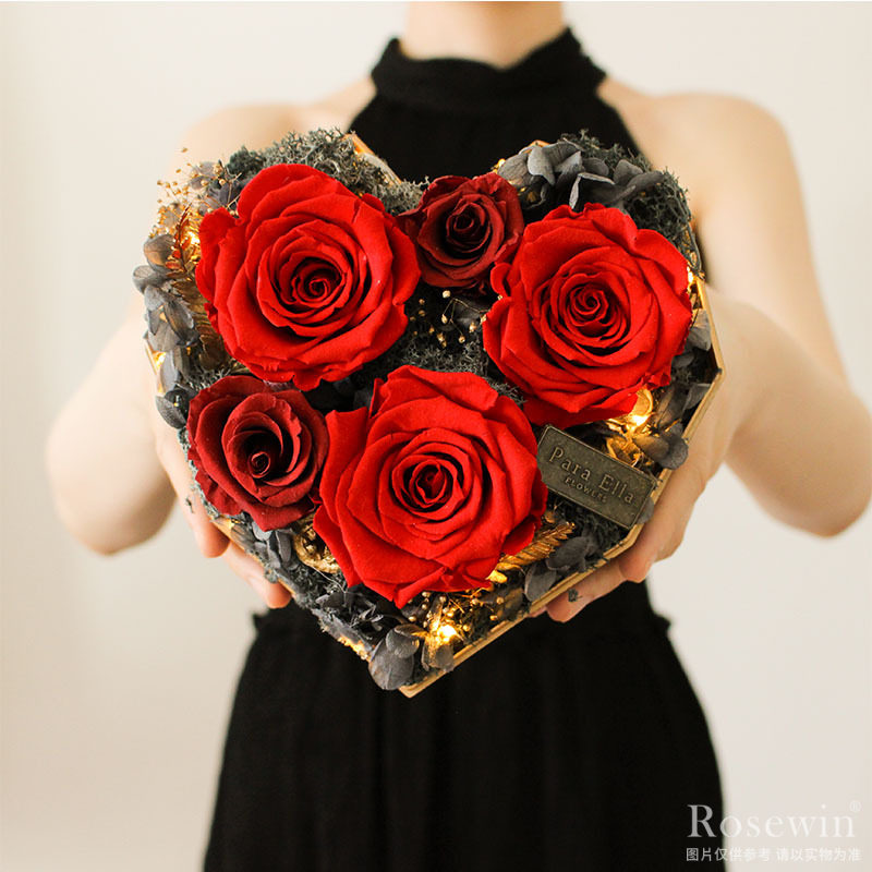 5朵永生紅玫瑰,搭配適量繡球花、滿天星、尤加利果、苔蘚、金葉、銅牌、串燈裝飾。(優(yōu)質(zhì)永生花顏色鮮艷,可保存3-5年之久,讓新鮮的玫瑰開滿四季)