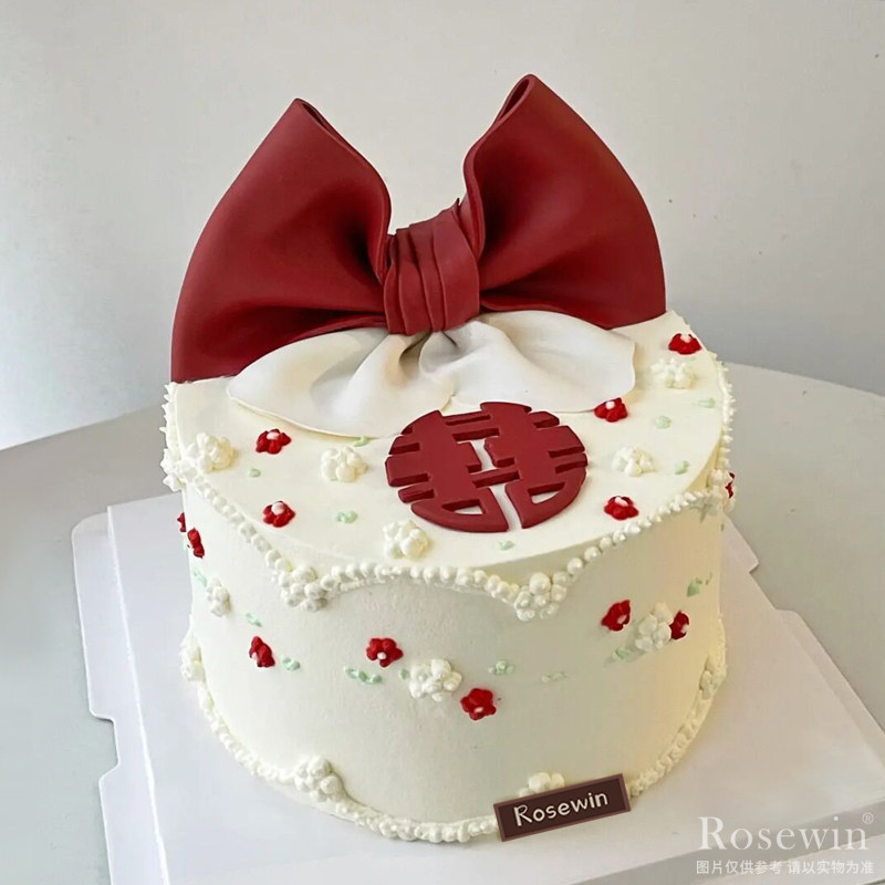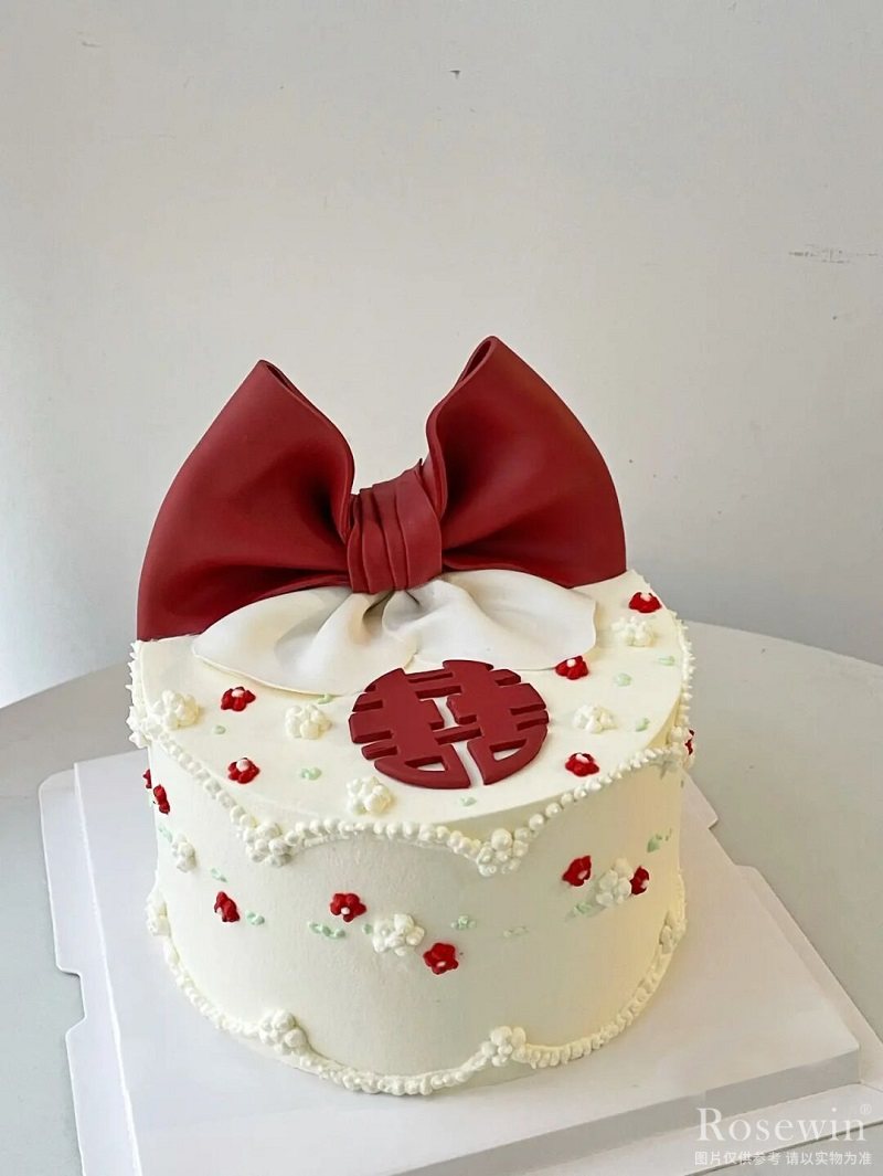內(nèi)層蛋糕胚+奶油(含水果果肉)疊層,表層翻糖蝴蝶結(jié),喜字等裝飾。(文案可定制,請(qǐng)下單時(shí)留言)