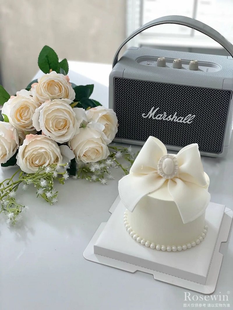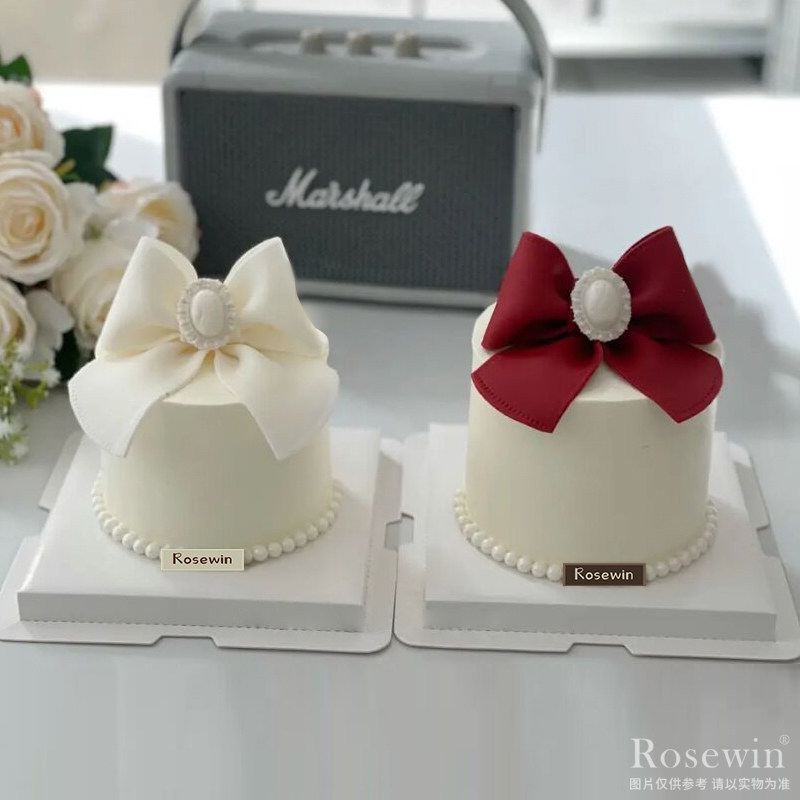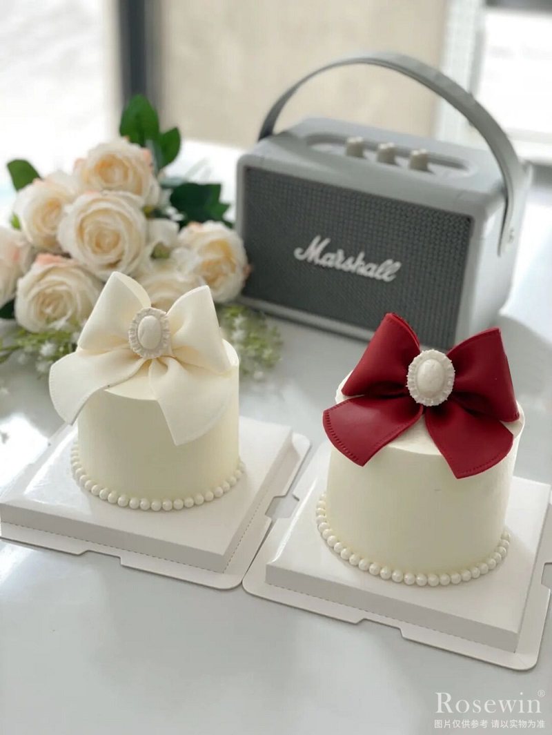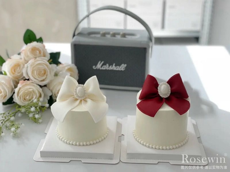內層蛋糕胚+奶油(含水果果肉)疊層,表層蝴蝶結翻糖、珍珠等裝飾