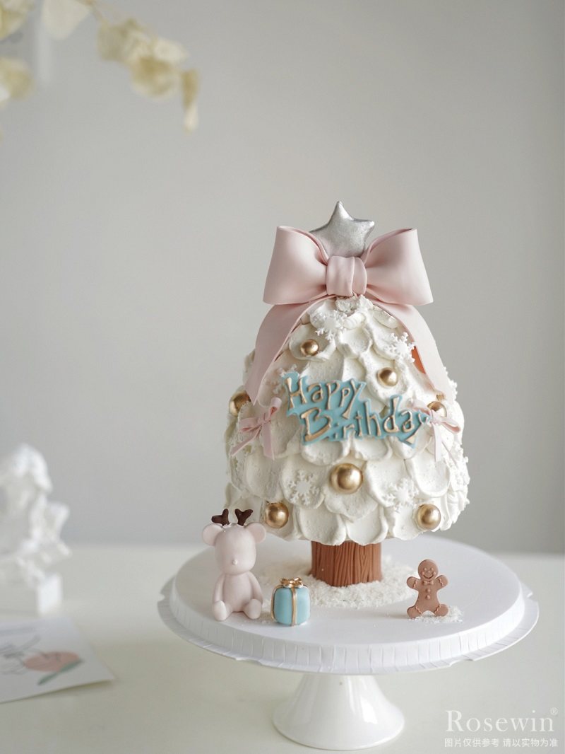內(nèi)層蛋糕胚+奶油(含水果果肉)疊層,表層粉色翻糖蝴蝶結(jié)等圣誕主題裝飾