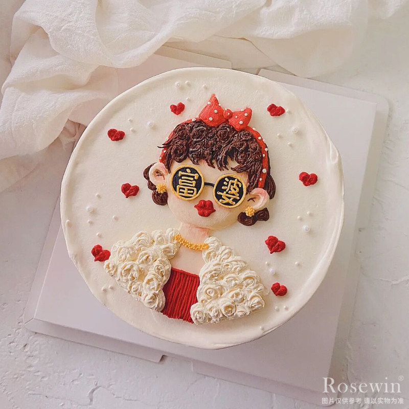 內(nèi)層蛋糕胚+奶油(含水果果肉)疊層,表層富婆主題手繪裝飾