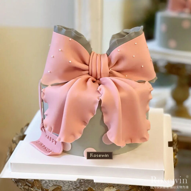 內層蛋糕胚+奶油(含水果果肉)疊層,表層翻糖蝴蝶結等裝飾