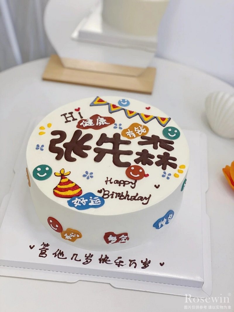 內(nèi)層蛋糕胚+奶油(含水果果肉)疊層,表層手繪圖案裝飾(文案可定制,請(qǐng)下單時(shí)留言)