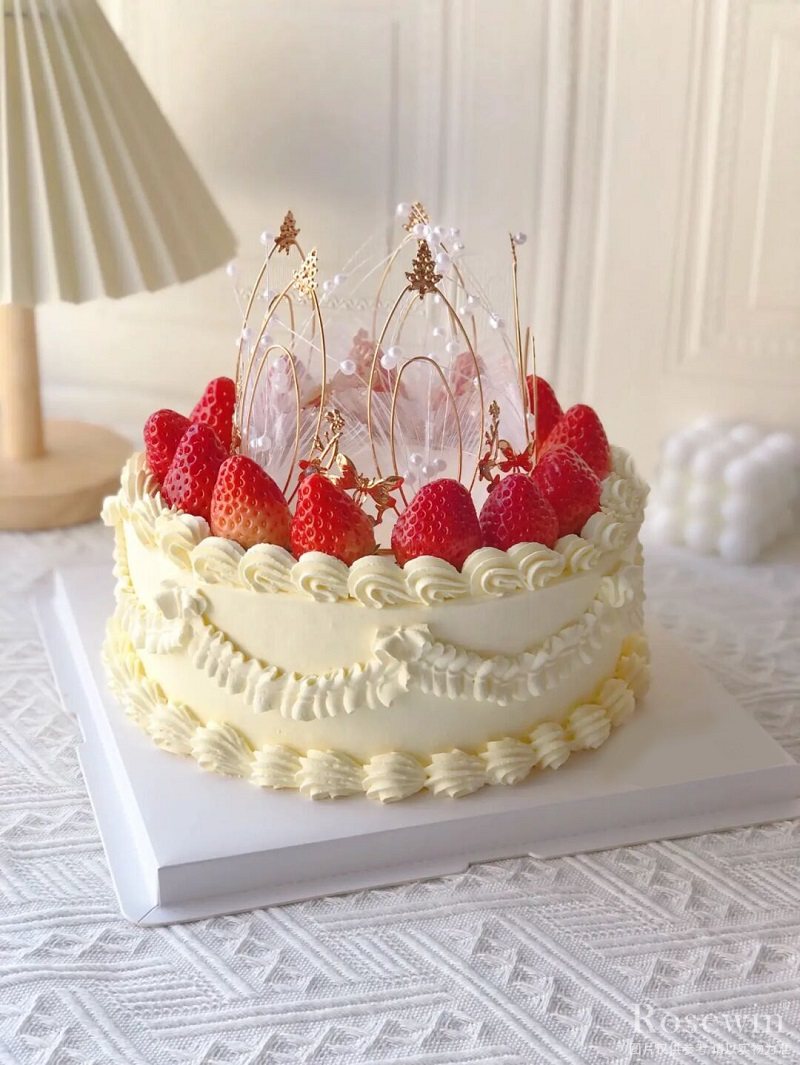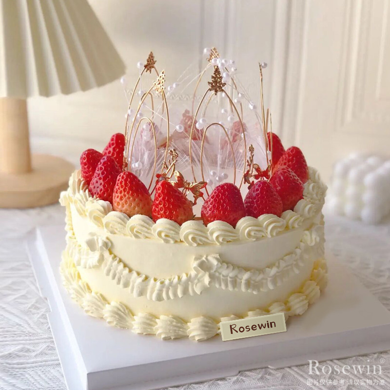 內(nèi)層蛋糕胚+乳脂奶油(含水果果肉)疊層,表層皇冠、草莓裝飾