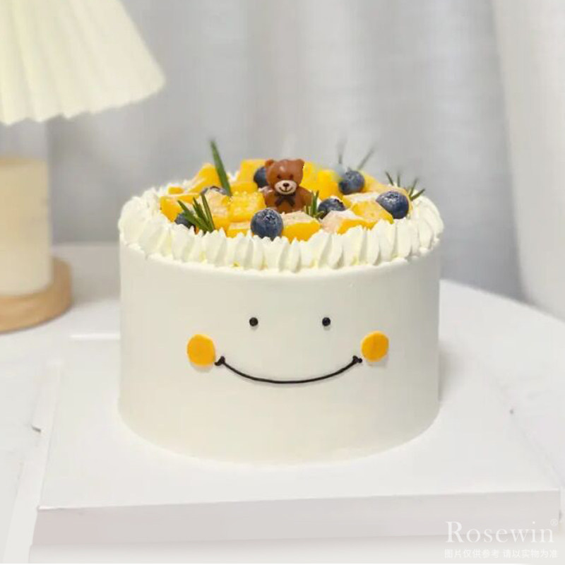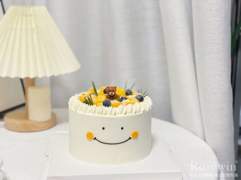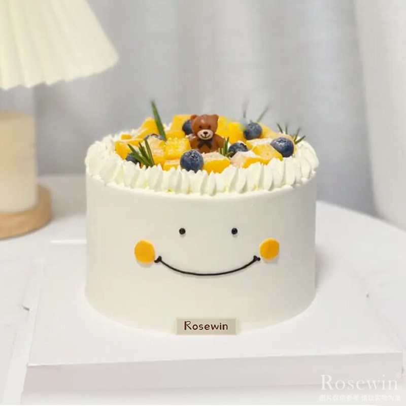 內(nèi)層蛋糕胚+乳脂奶油(含水果果肉)疊層,表層水果,一只可愛小熊裝飾