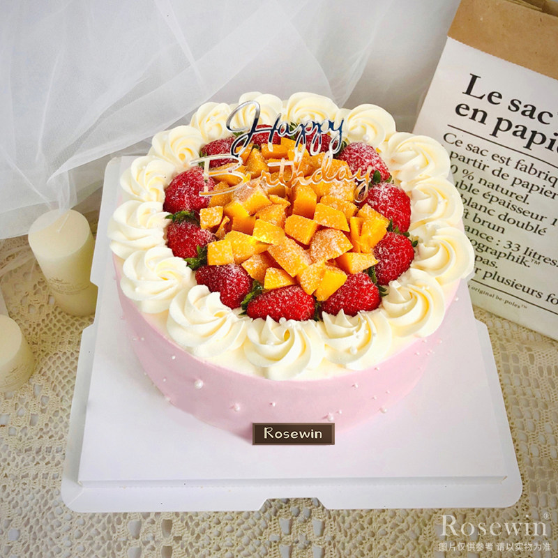 內層蛋糕胚+乳脂奶油(含水果果肉)疊層,表層豐滿芒果、草莓、生日插牌裝飾