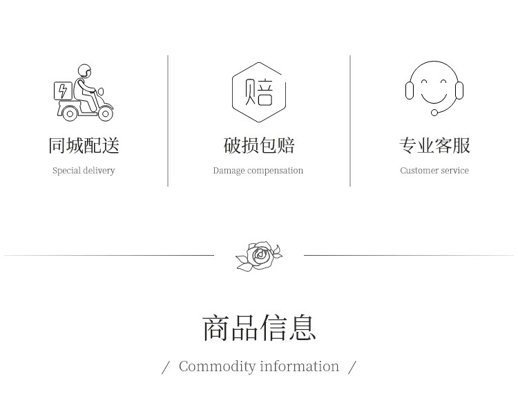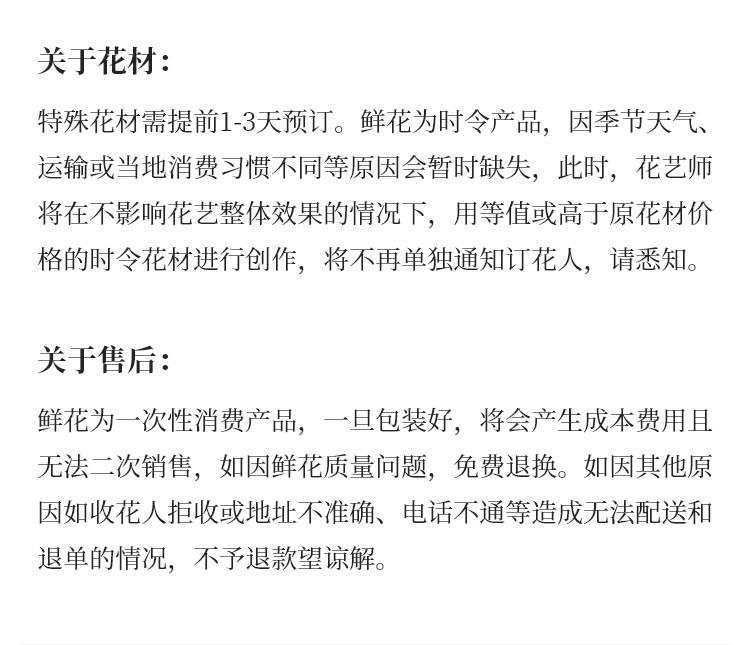 由于各地的花藝師不同,鮮花包扎可能在形式和搭配上與圖片不完全一致,但保證主花材的新鮮程度、數(shù)量、顏色與說(shuō)明一致,謝謝您的理解。
