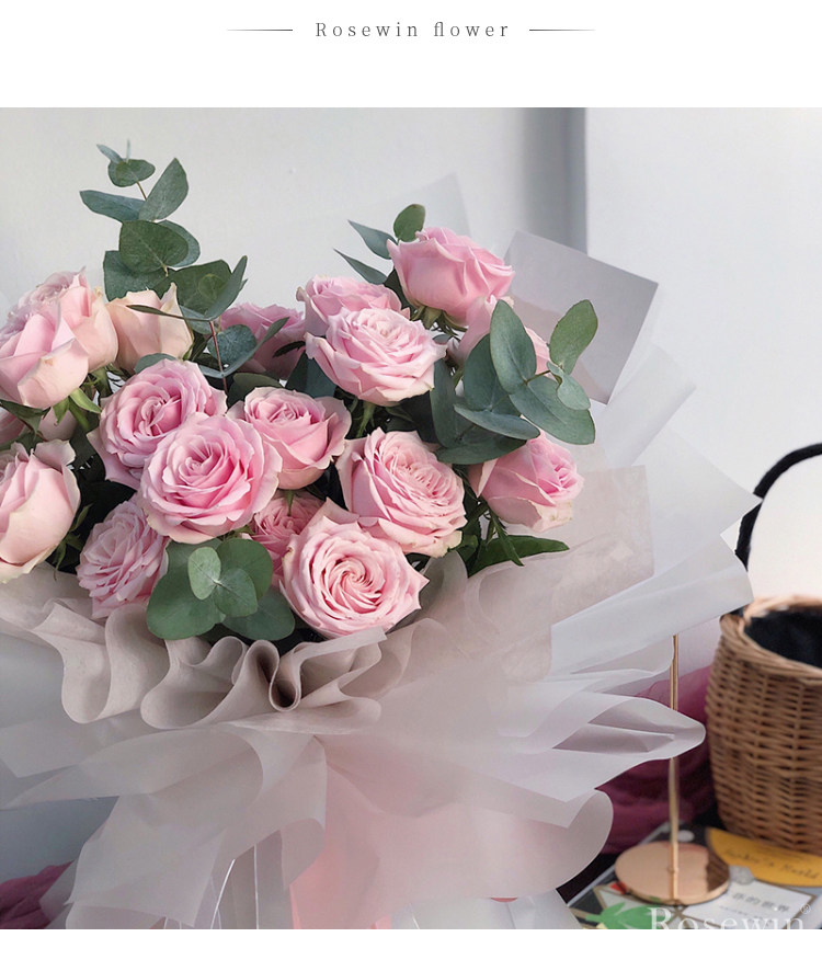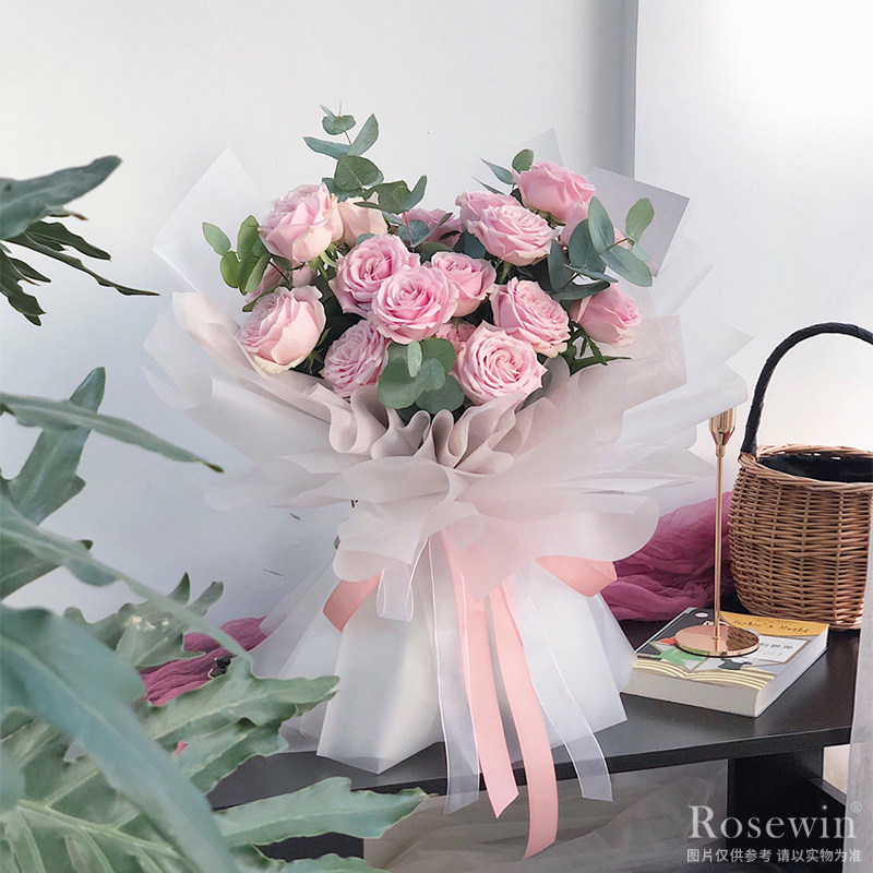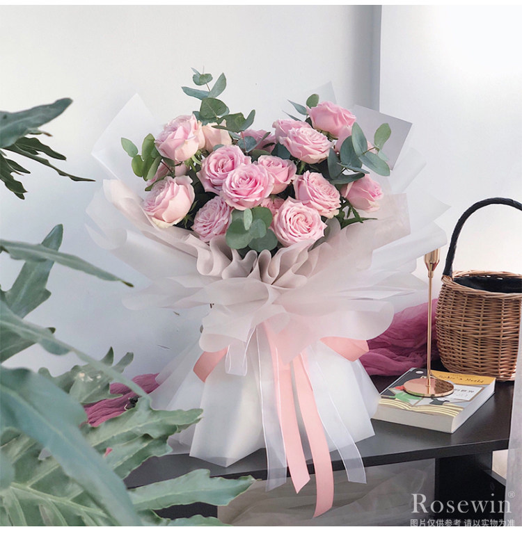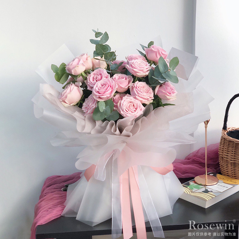 粉色霧面紙+白色霧面紙包裝,粉色緞帶+白色緞帶束扎。