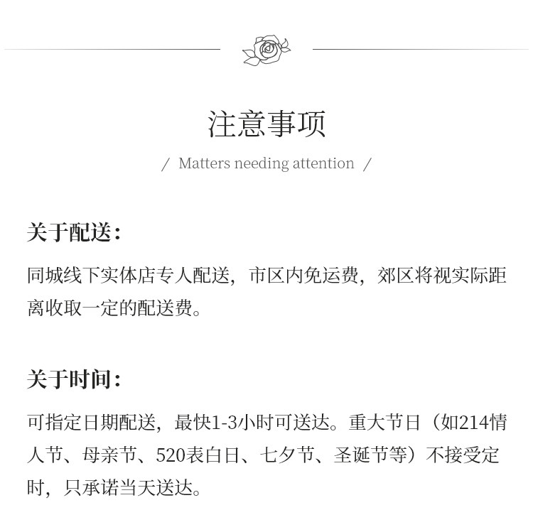 由于各地的花藝師不同,鮮花包扎可能在形式和搭配上與圖片不完全一致,但保證主花材的新鮮程度、數(shù)量、顏色與說明一致,謝謝您的理解。