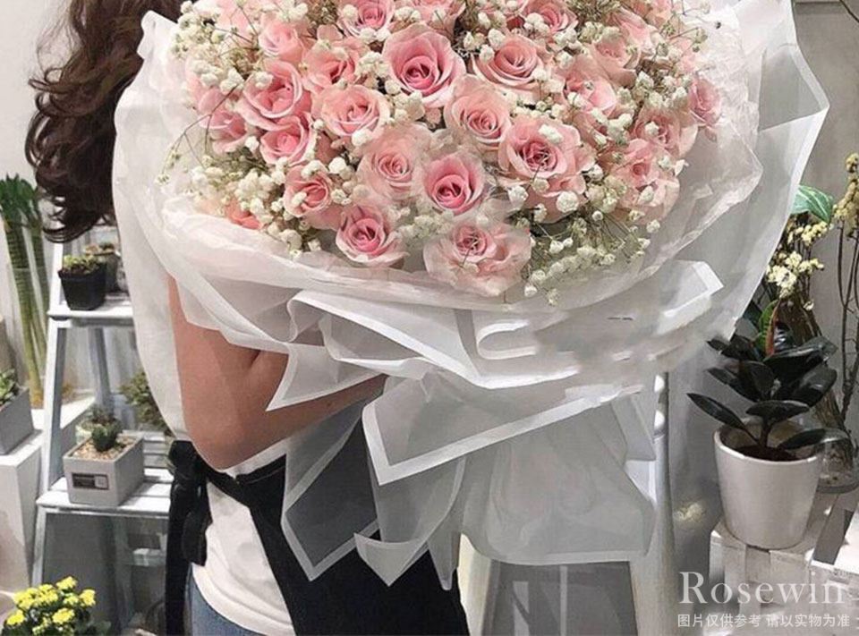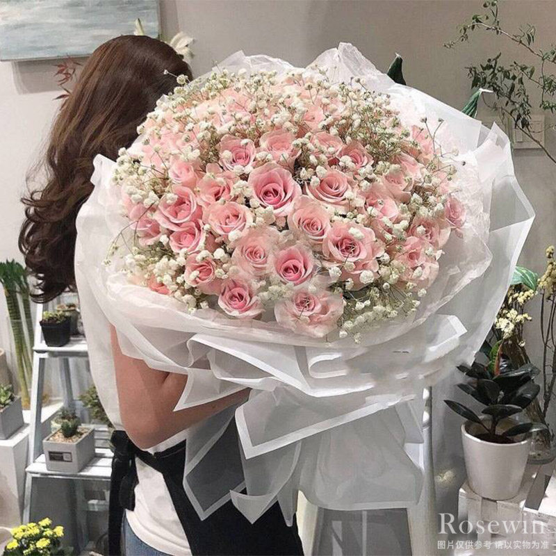 99朵粉佳人,搭配適量白色滿天星裝飾。