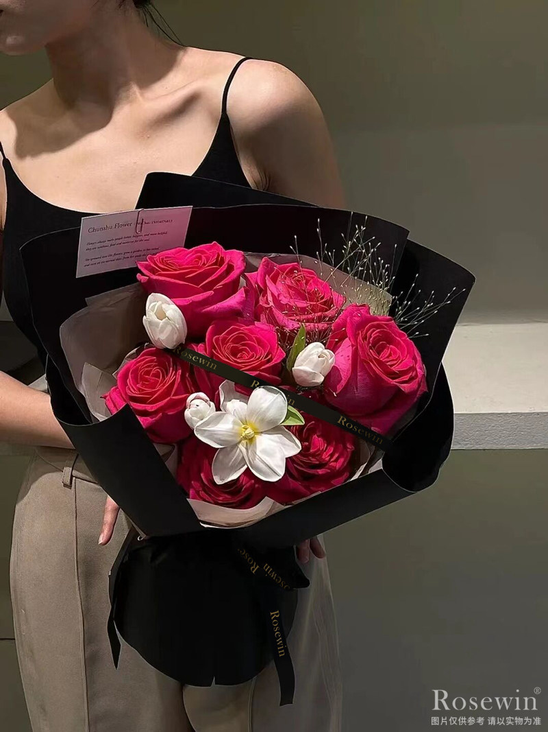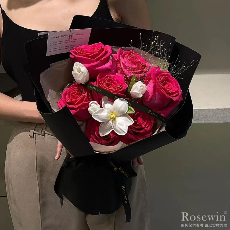 7朵弗洛伊德玫瑰,4朵白色郁金香