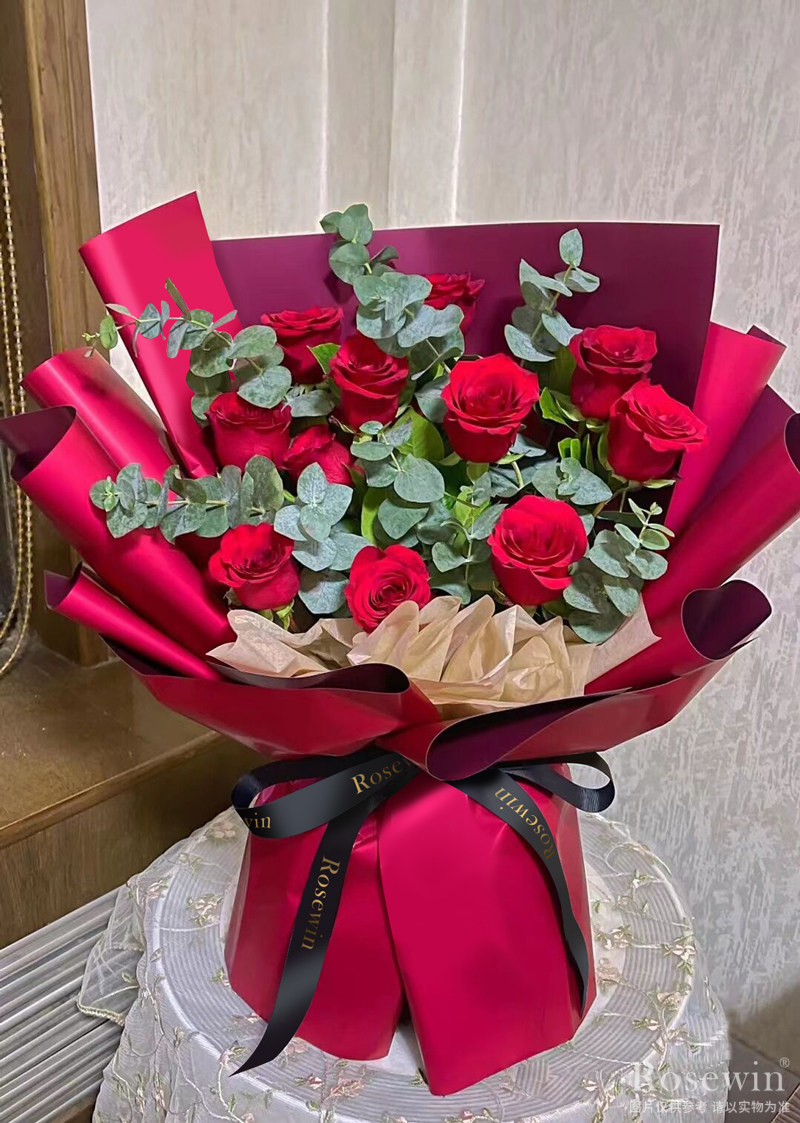 11朵紅玫瑰,豐滿尤加利葉裝飾