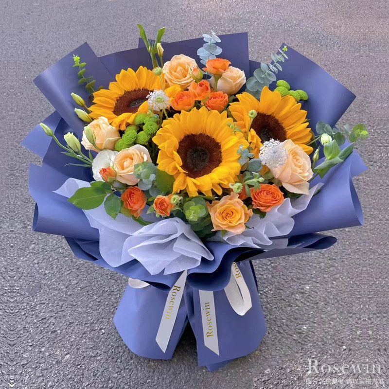 3朵向日葵,6朵香檳玫瑰,3支橘色多頭菊,2支綠色多頭菊,2支白色洋桔梗,適量尤加利葉裝飾