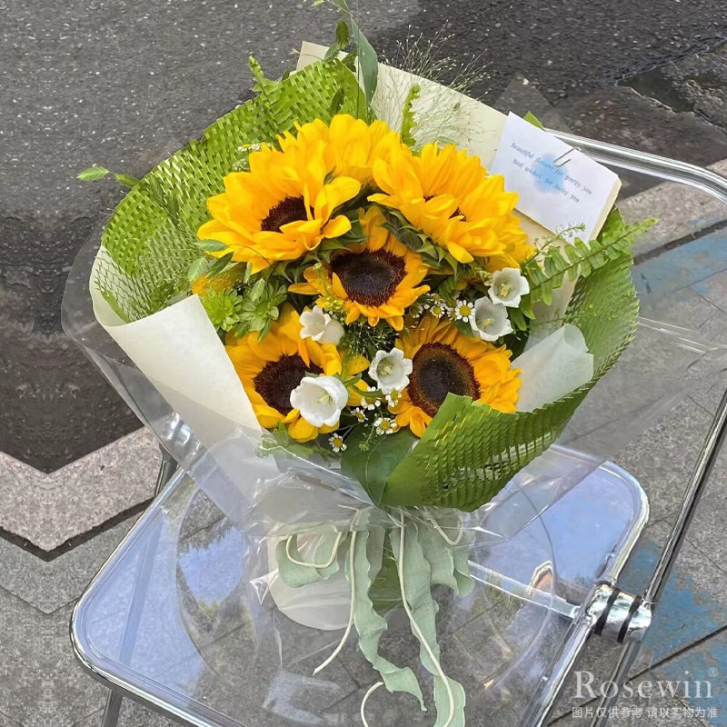6朵向日葵花束,適量綠色多頭小菊,白色風(fēng)鈴,洋甘菊,尤加利葉,噴泉草裝飾