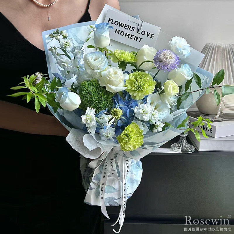碎冰藍(lán)玫瑰,驕傲玫瑰,藍(lán)繡球,綠色康乃馨,紫羅蘭,白色洋桔梗,松蟲草,綠毛球等混搭