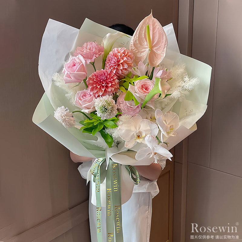 由于鮮花受季節(jié)限制,若無圖上花材,將用類似花材替代,介意者慎拍。各地的花藝師不同,鮮花包扎可能在形式和搭配上與圖片不完全一致,謝謝您的理解。
