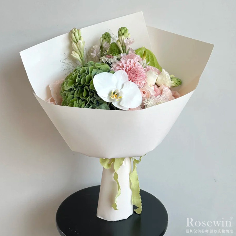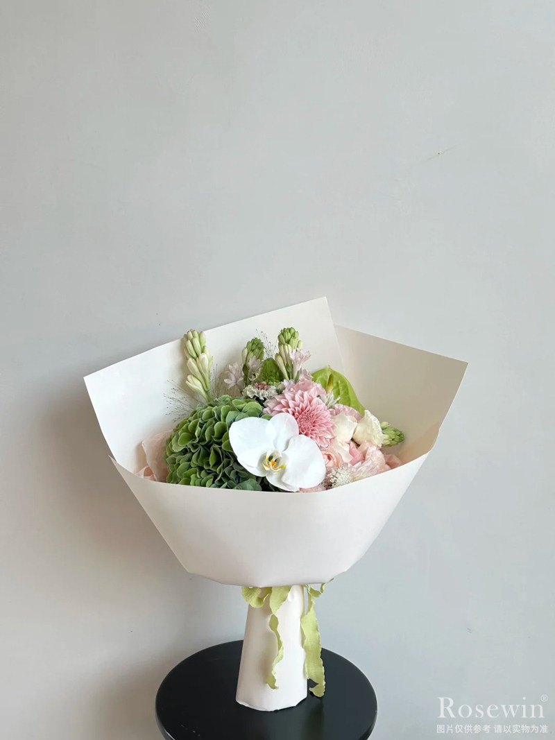 綠繡球、白色蝴蝶蘭、粉色牡丹菊、綠掌、粉玫瑰、白玫瑰、晚香玉等裝飾(由于鮮花具有季節(jié)性,若無圖上款式將用類似款代替,介意者慎拍)