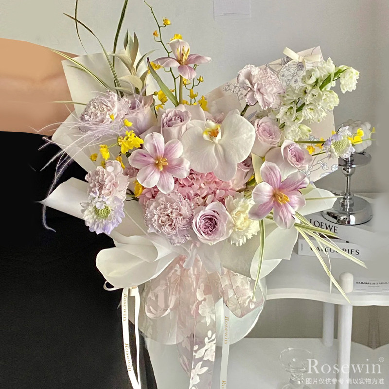 粉繡球、蝴蝶蘭、紫玫瑰、郁金香、淺紫色康乃馨、紫羅蘭等裝飾(由于鮮花具有季節(jié)性,若無圖上款式將用類似款代替,介意者慎拍)