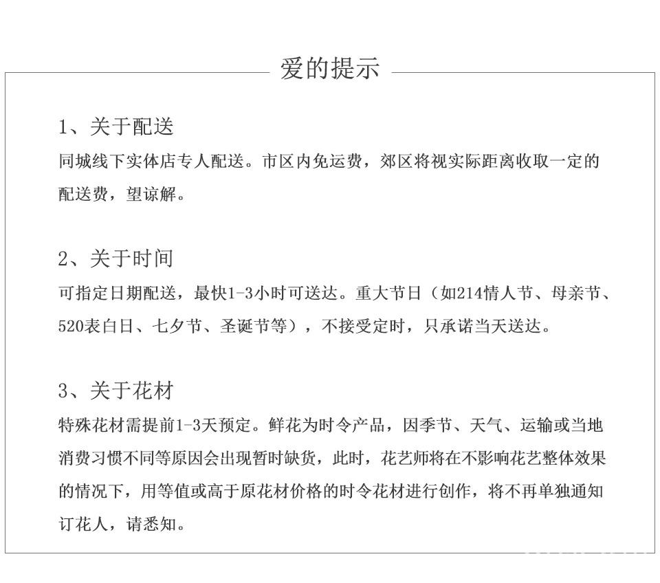 由于各地的花藝師不同,鮮花包扎可能在形式和搭配上與圖片不完全一致,但保證主花材的新鮮程度、數(shù)量、顏色與說明一致,謝謝您的理解。