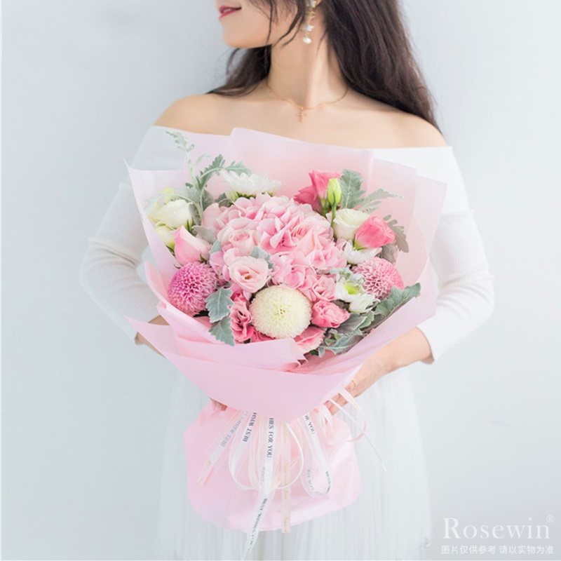 粉色霧面紙韓式扇形包裝,精美白色英文字母緞帶束扎。
