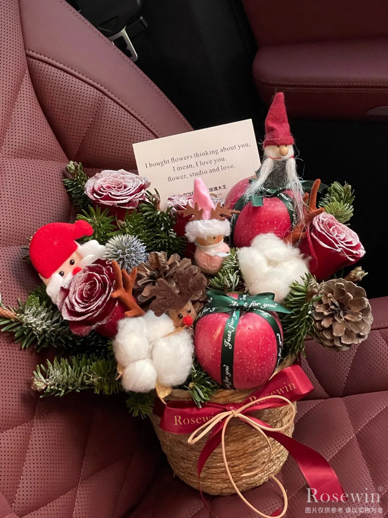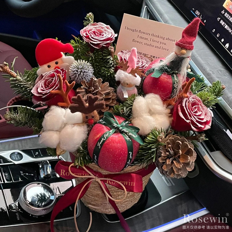 紅蘋果、紅玫瑰、棉花、松果、綠葉等裝飾