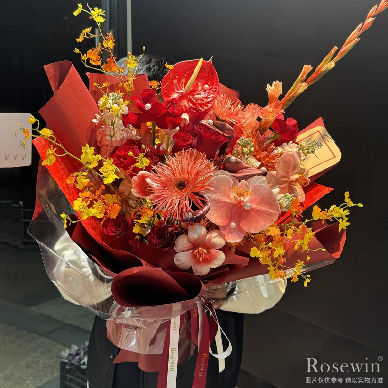 由于各地的花藝師不同,鮮花包扎可能在形式和搭配上與圖片不完全一致,但保證主花材的新鮮程度、數(shù)量、顏色與說明一致,謝謝您的理解。