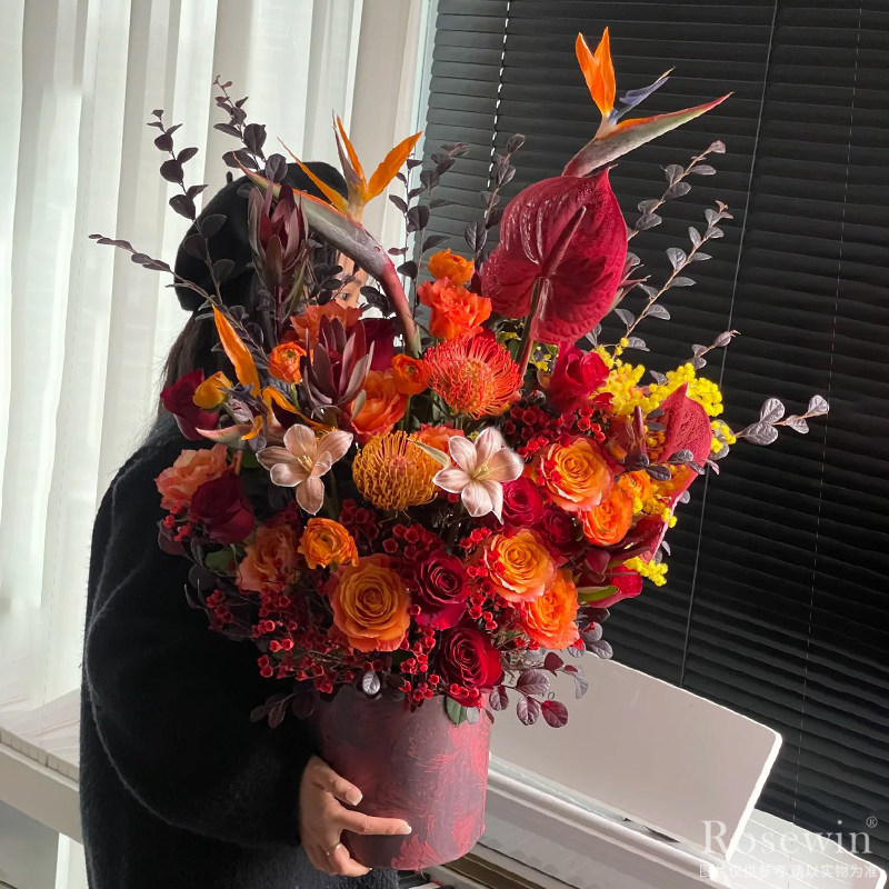 針墊花、橘色玫瑰、紅掌、橘色多頭玫瑰、天堂鳥、澳梅、郁金香等混搭