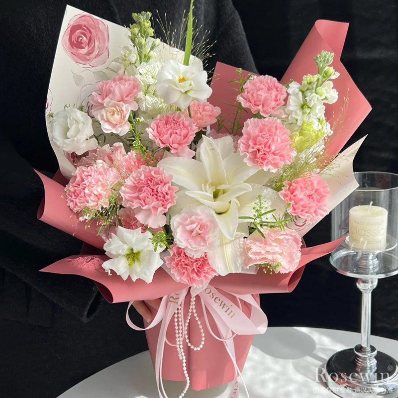 11支粉色康乃馨,1支白色多頭香水百合,2支粉色多頭康乃馨,2支白色洋桔梗,白色紫羅蘭等混搭