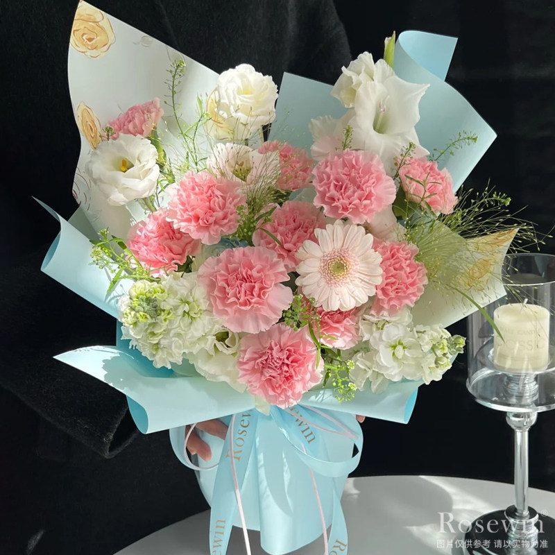 11朵粉色康乃馨,洋桔梗,紫羅蘭等裝飾。
