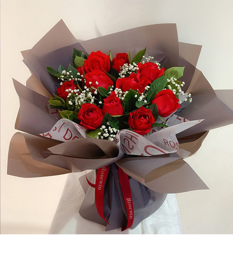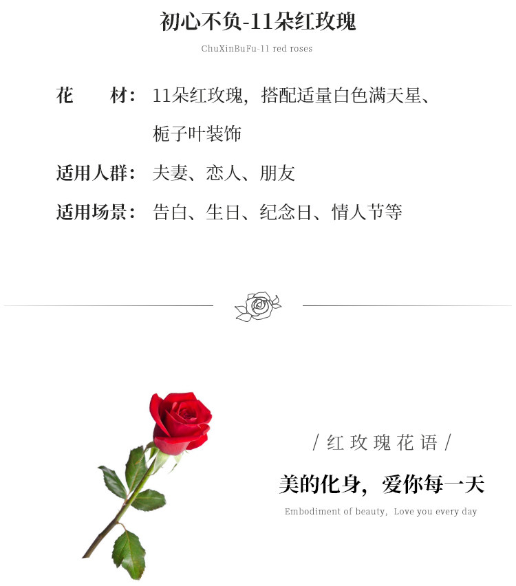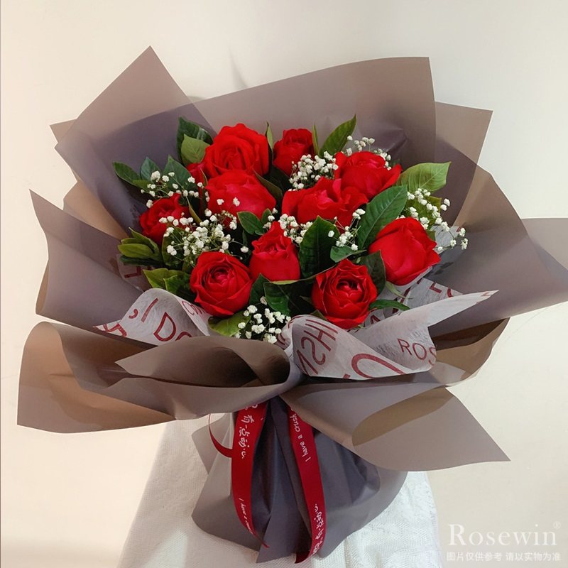 11朵紅玫瑰,搭配適量白色滿天星、梔子葉裝飾